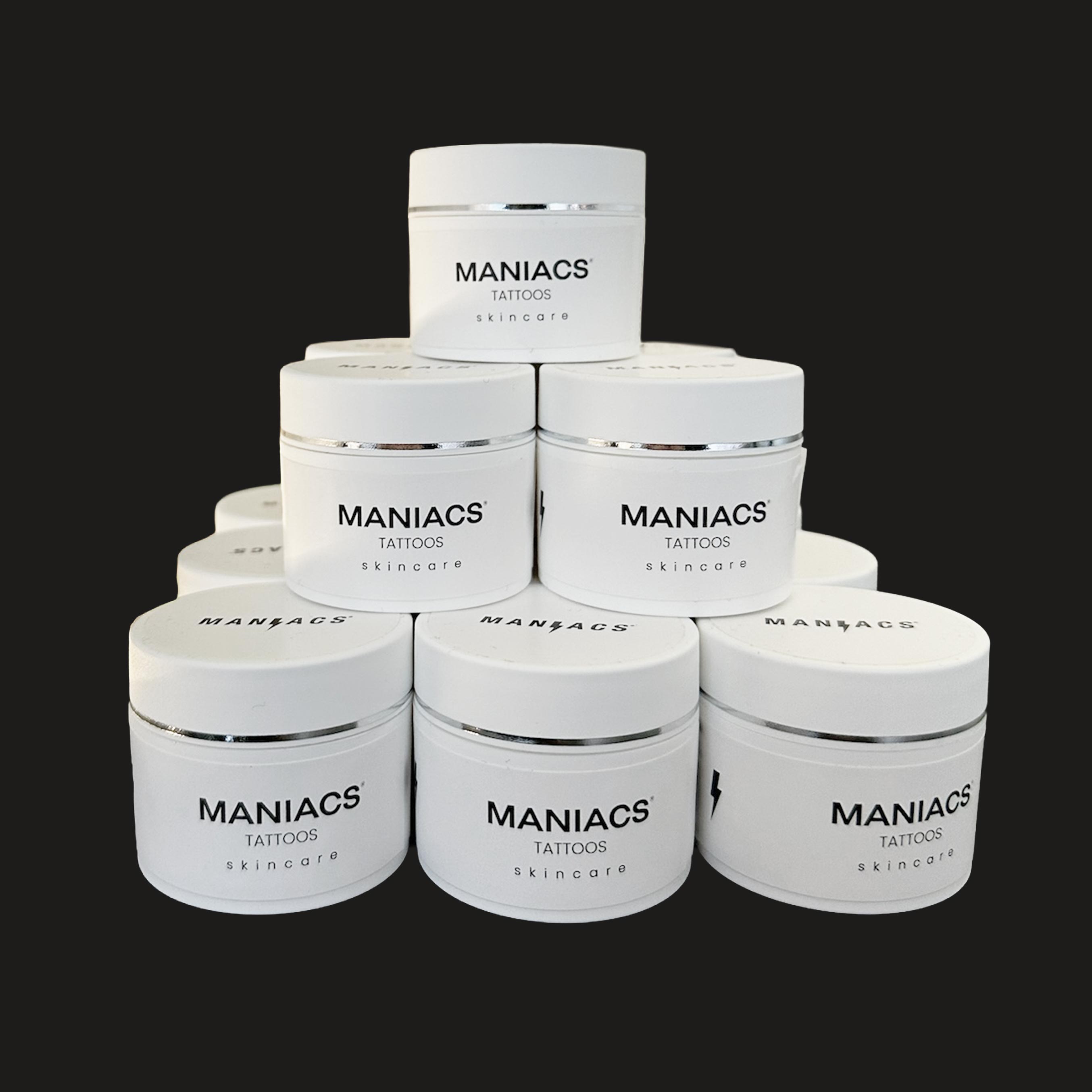 MANIACS® Skincare beschleunigt die Heilung, schützt frisch tätowierte Haut und bewahrt die Farben. Hochwirksame, saubere Formulierung – entwickelt für maximale Regeneration. Beruhigt sofort, stärkt langfristig und hält dein Tattoo so klar, wie es gestochen wurde.